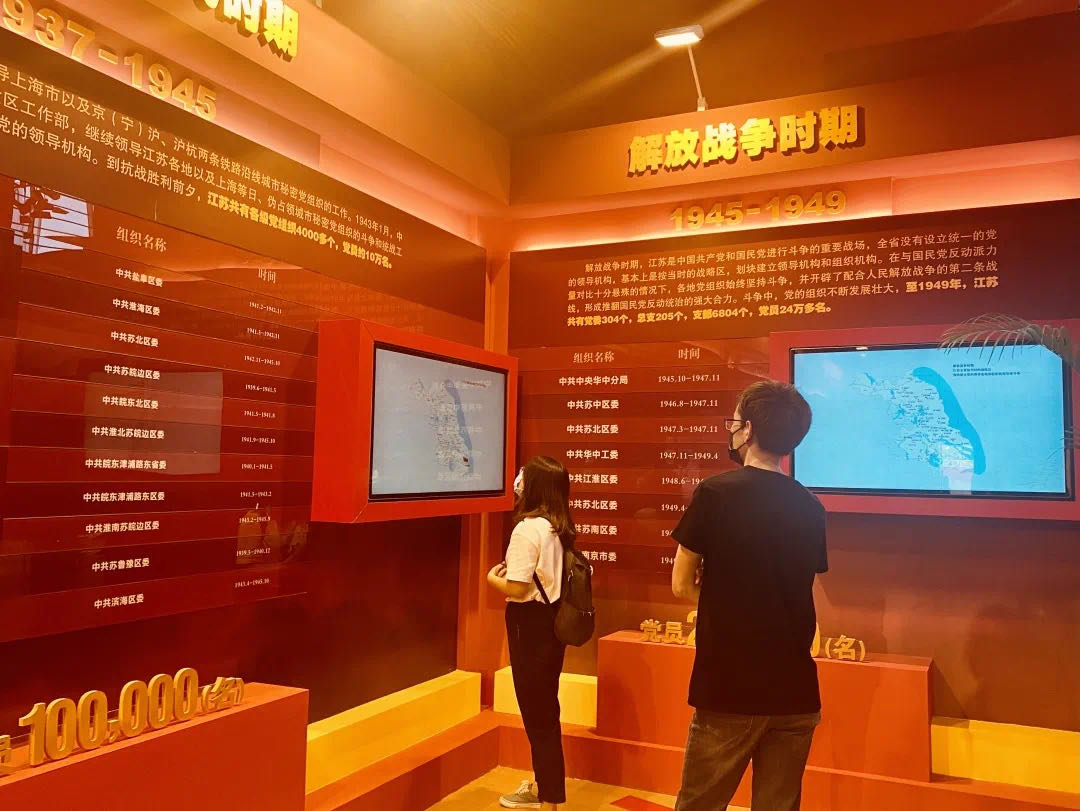 主體展區(qū)按照歷史分期劃分為四個部分:第一部分時間跨度為1921年中國共產(chǎn)黨成立前后至1949年江蘇全境解放,突出反映江蘇第一個黨組織的成立;第二部分時間跨度為1949年10月1日新中國成立至1978年12月,突出反映毛澤東等老一輩革命家對江蘇的親切關(guān)懷;第三部分時間跨度為1978年12月黨的十一屆三中全會召開到2012年11月,突出反映鄧小平、江澤民、胡錦濤等黨和國家領(lǐng)導(dǎo)人對江蘇的殷切期望和親切關(guān)懷;第四部分時間跨度為2012年黨的十八大召開至今,突出反映黨的十八大以來習(xí)近平總書記對江蘇工作殷切期望親切關(guān)懷,為江蘇新時代發(fā)展擘畫的宏偉藍圖。