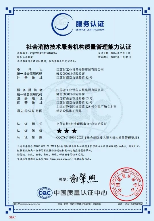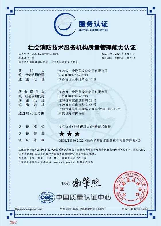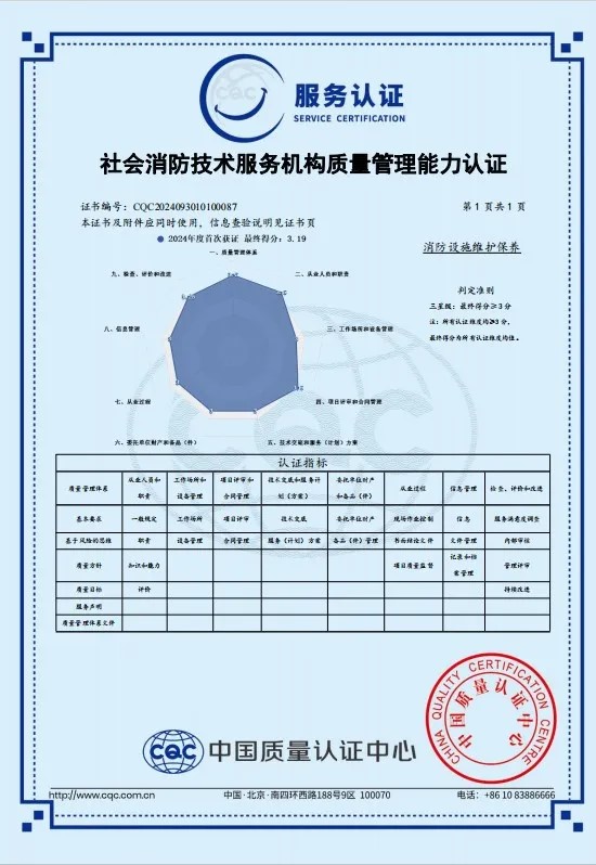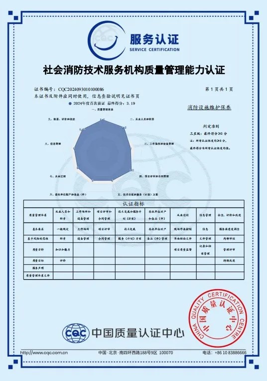 今年,我司成功通過(guò)“社會(huì)消防技術(shù)服務(wù)機(jī)構(gòu)質(zhì)量管理能力認(rèn)證”。此項(xiàng)認(rèn)證標(biāo)志著省安在消防設(shè)施維護(hù)保養(yǎng)工程領(lǐng)域的專業(yè)程度和質(zhì)量管理能力達(dá)到了新的高度。消防設(shè)施是保障公共安全的重要設(shè)施,定期的維護(hù)保養(yǎng)是確保其正常運(yùn)行的關(guān)鍵。此項(xiàng)認(rèn)證通過(guò),無(wú)疑展示了我司關(guān)于消防設(shè)施維護(hù)保養(yǎng)的專業(yè)能力以及對(duì)我司消防技術(shù)服務(wù)質(zhì)量的高度認(rèn)可。未來(lái),我們將以更高的標(biāo)準(zhǔn)要求自己,持續(xù)提升我們的服務(wù)質(zhì)量,為客戶提供更加優(yōu)質(zhì)的服務(wù)。
