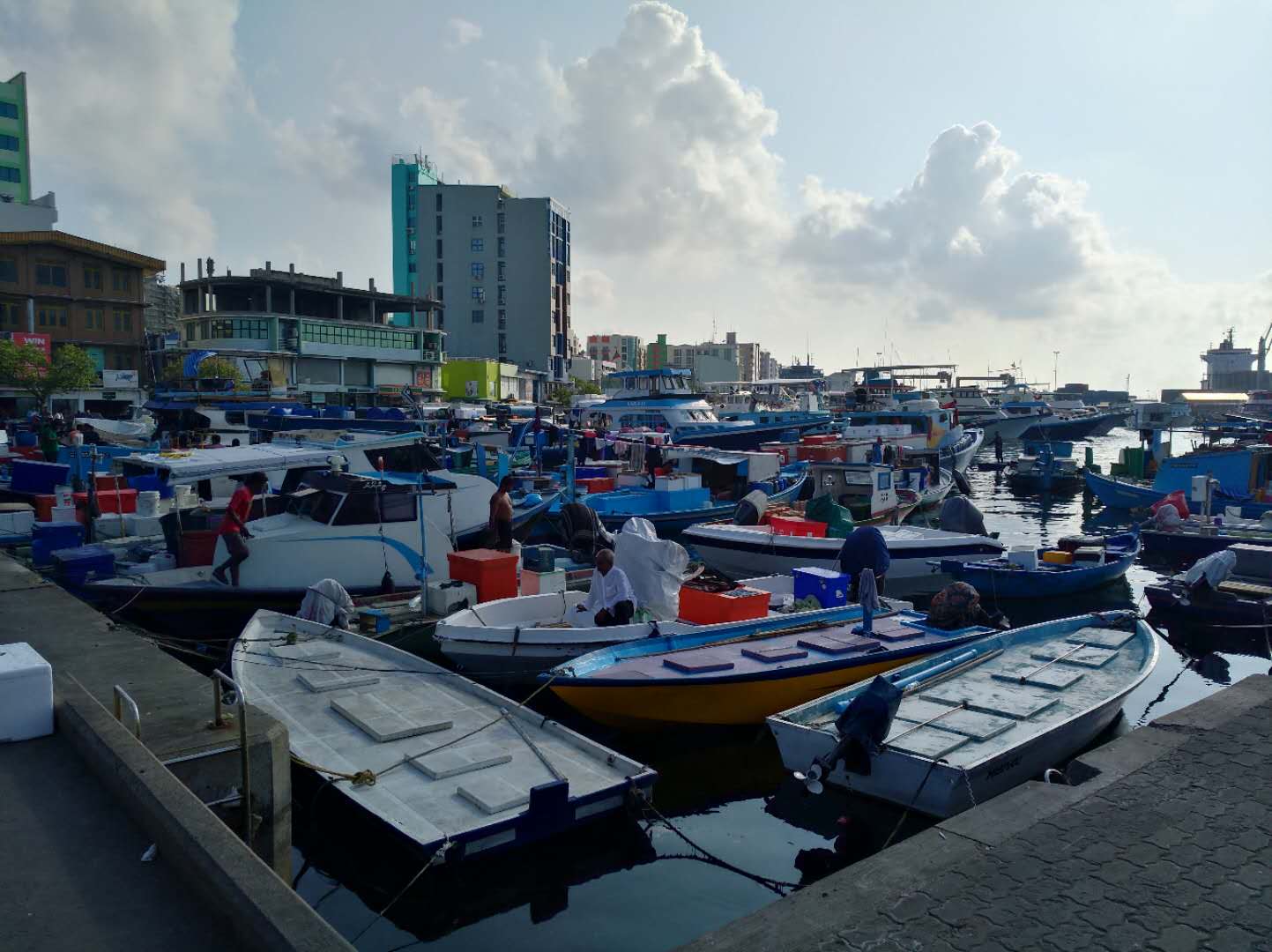 首都馬累聚集了全國人口的60%以上,道路擁堵不堪,僅有兩三條馬路為三車道,多數(shù)為破舊的單雙車道(所以馬累的道路多為單行線)。這里最靚麗的是摩托車特別多,在道路上穿插急馳,讓人膽戰(zhàn)心驚。所有道路上都會有一邊用于停車,只見??繚M滿的摩托車使得本來就不寬的道路顯得更是擁擠不堪。這里的衛(wèi)生狀況也不及斯里蘭卡好,特別是海邊,集滿了塑料瓶等垃圾。馬累島雖為首都,但面積不大,只有1萬多平方公里。我們的工地位于島嶼最北面,施工人員卻住在最南面,僅2000多米,步行20分鐘左右即可,島嶼之小可見一斑。馬累島是全國政治、經(jīng)濟中心,同時也是港口城市。有一個相對這個首都而言占地面積很大的市民廣場、一個建于17世紀(jì)的古清真寺、還有喧鬧繁忙的魚市。唯一的國際機場在胡魯馬累島,渡輪僅需10分鐘即可抵達。中國援建的連接兩島的大橋正在緊鑼密鼓施工中,建成后往返于兩島會更加方便,據(jù)了解也會把大批首都人口向那里遷移,緩解人口密度大的困擾。