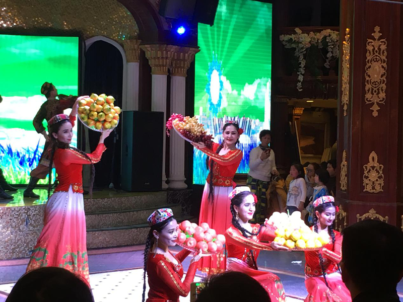 酒店的餐廳和飲食頗有特色,每天吸引了眾多食客來此用餐。給我印象深刻的是,在這里入住,不僅可以品嘗正宗的新疆美食,還能免費欣賞到充滿民族風情的歌舞表演。維吾爾族能歌善舞,維族美女婀娜多姿,的確名不虛傳。頭戴小花帽的男主持人語言幽默,擅長與客人互動,在感染力極強的維族音樂聲中,常能激發(fā)客人的跳舞欲望,再與維族演員手拉手共舞,現(xiàn)場氣氛掀起陣陣高潮。